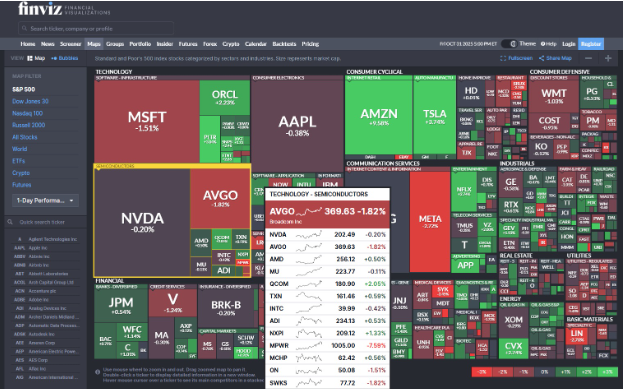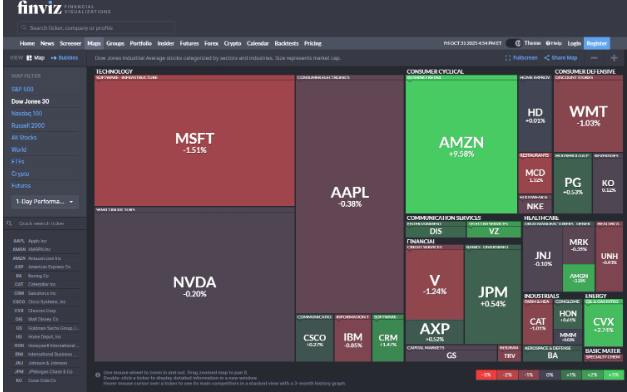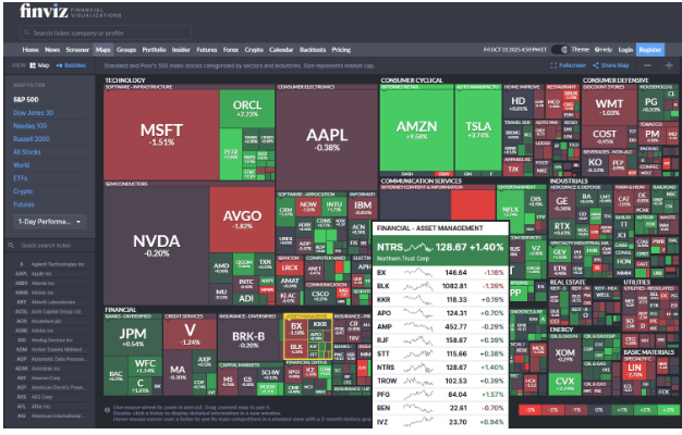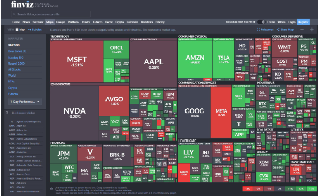 Finviz is perhaps best known for its iconic Market Maps—a powerful visualization tool that immediately provides a high-level view of daily or weekly sector performance. Instead of scrolling through lengthy indices, the Market Map presents the entire U.S. market as a dynamic, color-coded grid. Each rectangle on the map represents a company, and the size of the rectangle is relative to its market capitalization. The color—shades of green or red—indicates the stock’s performance for the selected time frame.