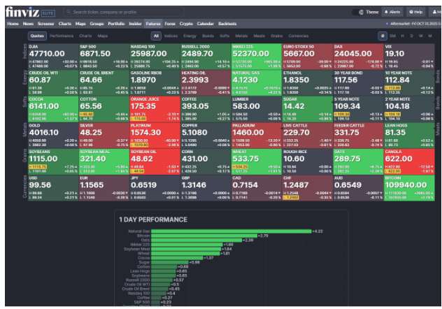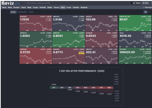 Furthermore, Finviz includes up-to-the-minute data on Futures and Forex markets. The inclusion of major currency pairs (like EUR/USD) and commodity contracts (such as Crude Oil and Gold) allows for crucial intermarket analysis—the practice of viewing how different asset classes influence one another. For example, a swing trader looking at energy stocks might simultaneously monitor the price trend of the underlying Crude Oil futures, a key driver for the entire Energy sector. While the charting capabilities for futures and forex may not be as robust as a dedicated platform, the data serves its purpose as a reliable and accessible reference point. The ability to quickly check market indexes, global performance, and currency trends on a single, efficient dashboard reinforces Finviz’s value as a universal market monitoring tool.