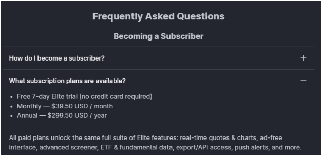 Finviz Elite (which typically costs around $39.50/month, or less with an annual plan) unlocks real-time data and crucial quality-of-life features. Elite members gain access to advanced charting tools, including performance comparisons and drawing tools, along with full access to custom filters and advanced backtesting capabilities. For a professional trader, the cost is justified by the immediate access to real-time quotes, which eliminates the execution risk of using delayed data, and by the sheer power of the advanced backtesting engine. The upgrade shifts Finviz from being a preparatory tool to a vital real-time monitoring tool.